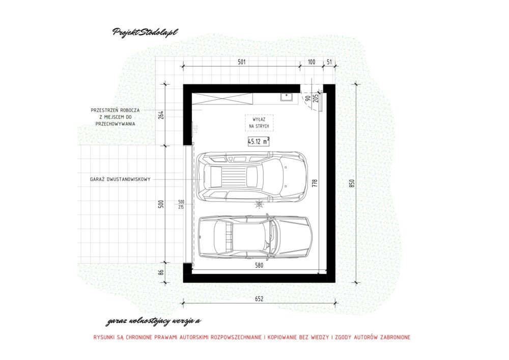 Are you lacking storage space? Or perhaps you have a camper trailer or simply want to build a garage in a different location independent of the house? We have a great option for you! A freestanding two-car garage is one of the available additions to our barn-style buildings. It is designed to visually correspond with the residential building. The freestanding garage version is dedicated to the S+ and Optimum Barns, as it shares the same non-eave roof with the same angle of inclination, subdued elevation, and simple form. Inside, there are two parking spaces and a designated alcove with storage space. Additionally, the attic can be accessed through a hatch (with 3.66 m² of usable space – much more if counting the floor area!)—this maximizes the utilization of the garage’s volume. For added convenience, a utility sink is proposed.