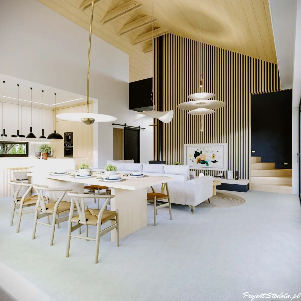 From the front side of the plot, a convenient two-car garage is designed, connected to the residential building through a utility room with a laundry area. The main entrance to the building, however, is designed on the side wall. This solution leads us directly into the vestibule, which is directly connected to the living area – the living room with the kitchen, which beautifully opens up to the garden through large windows. Upon entering such a high-ceilinged space, open to the roof structure, we will certainly make an impression on any visitor.