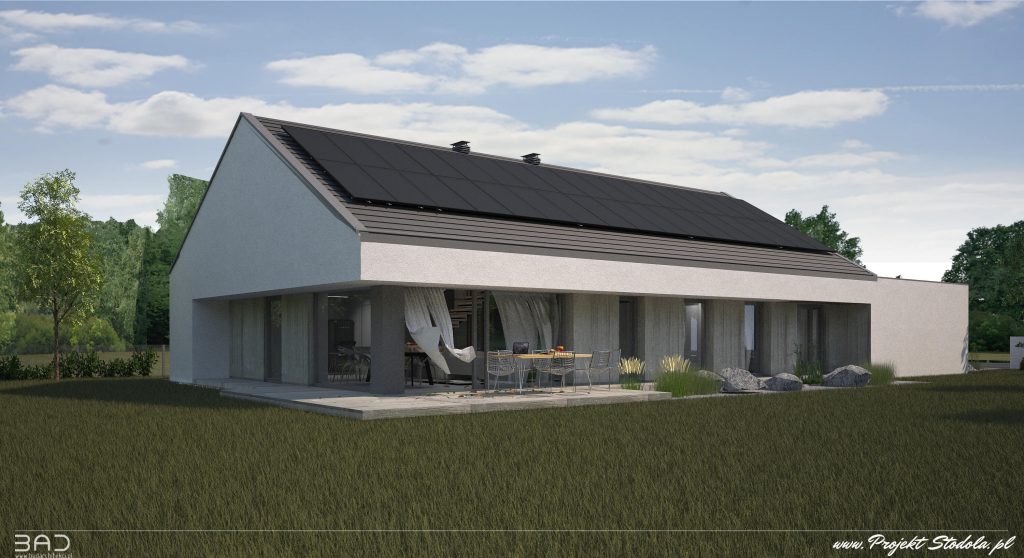 Dodatkowo prosty, dwuspadowy dach pozwala na montaż instalacji fotowoltaicznej w ilości nawet do 51 paneli co generuje moc ok 15 kW. Na wizualizacjach zaprezentowano 34 panele generujące ok. 10 kW mocy.