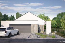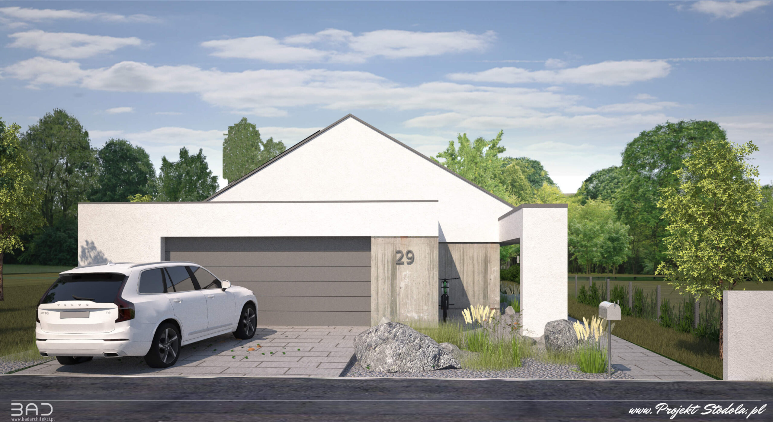 Prosty dom parterowy (z możliwością adaptacji poddasza), na planie prostokąta, przykryty dwuspadowym, symetrycznym dachem o kącie nachylenia 30° (kalenica prostopadła do drogi dojazdowej). Do budynku, od strony wjazdowej, dostawiono bryłę garażu (bryła jest niezależna i budynek może istnieć bez garażu). Bardzo prosty układ konstrukcyjny opierający się na trzech osiach, prosty dwuspadowy dach i drewniany strop sprawia, że dom jest łatwy i ekonomiczny w budowie. Elewacja budynku- nowoczesna i minimalistyczna, w tonacji naturalnej- biel połączona z betonem architektonicznym. Istnieje możliwość dopasowania materiałów tak, by nawiązać do lokalnego kontekstu lub indywidualnych upodobań inwestora. Urbanistycznie budynek pasuje do wąskich działek najlepiej z wjazdem od zachodu i wschodu. Bryła garażu znajduej , się z przodu budynku, następnie pokoje mieszkalne, na końcu budynku znajdue się saon otwierający się na część ogrodową działki. Projekt dostępny jest w wersji lustrzanego odbicia.