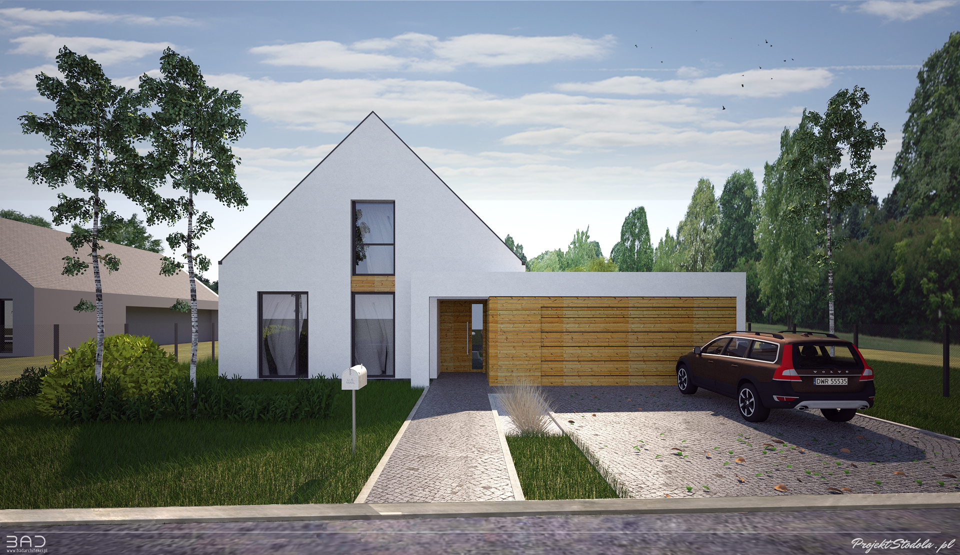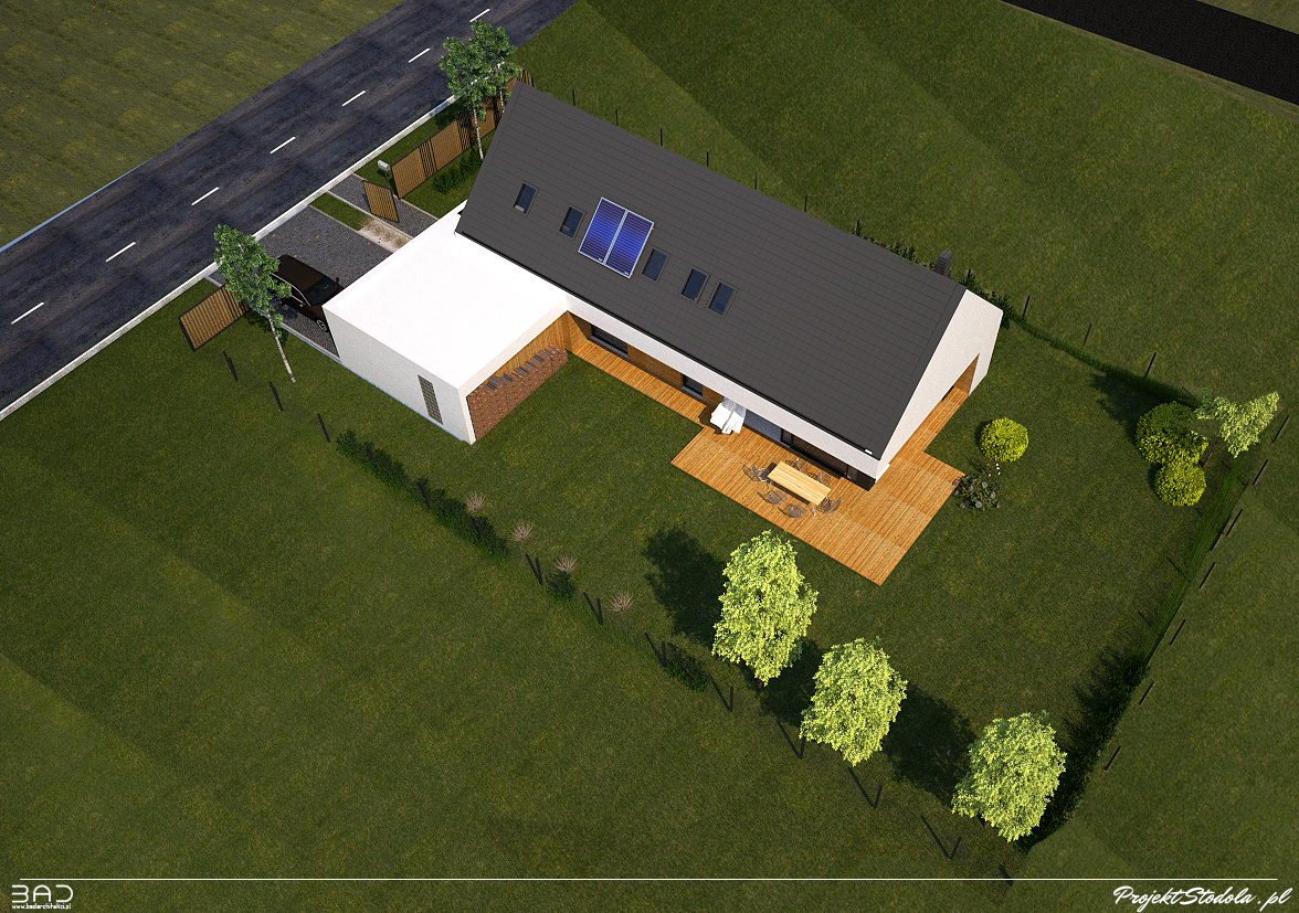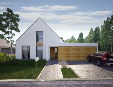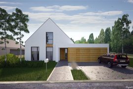 Prosty dom mieszkalny dwukondygnacyjny na planie prostokąta przykryty dwuspadowym, symetrycznym dachem o kącie nachylenia 45° (kalenica prostopadła do drogi dojazdowej). Projekt przystosowany jest do wymogów MPZP -dwuspadowego, stromego dachu. Do budynku, od strony wjazdowej, dostawiono bryłę garażu (może niezależnie istnieć bez niego). Prostota układu i konstrukcji sprawia, że dom będzie prosty i ekonomiczny w budowie. Elewacja budynku- nowoczesna i minimalistyczna, w tonacji naturalnej- biel połączona z naturalnym, ciepłym drewnem. Istnieje możliwość dopasowania materiałów tak by nawiązać do lokalnego kontekstu. Urbanistycznie budynek pasuje do działki z wjazdem od zachodu lub wschodu w wersji z lustrzanym odbiciem.