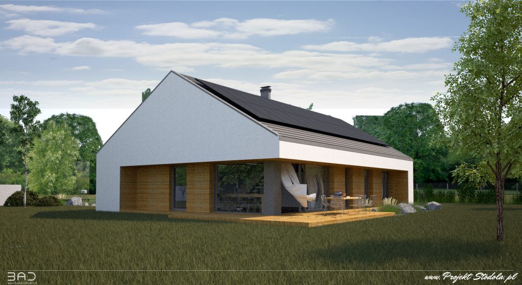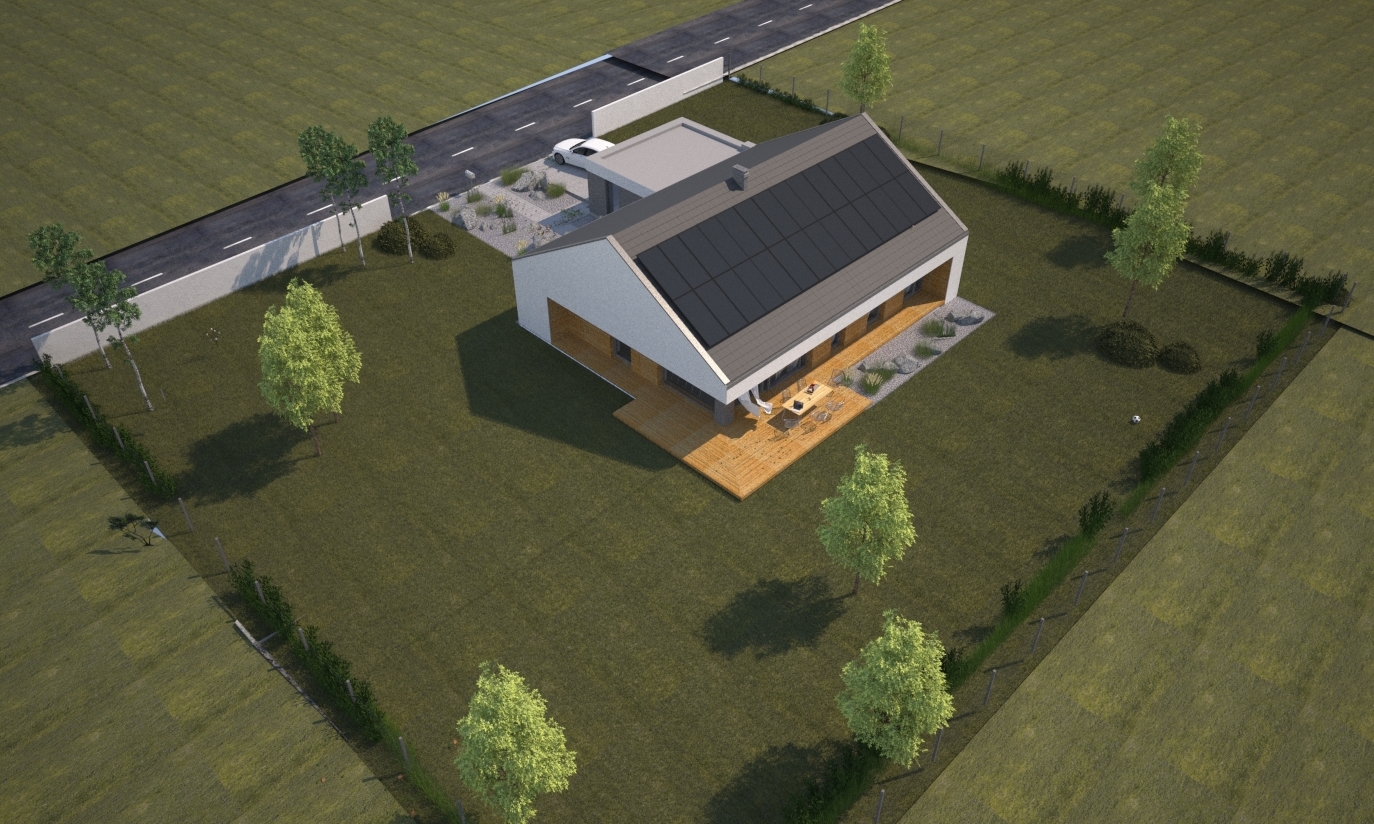 Dodatkowo prosty, dwuspadowy dach pozwala na montaż instalacji fotowoltaicznej w ilości nawet do 42 paneli co generuje moc ok 12,5kW. Na wizualizacjach zaprezentowano 28 panele generujące ok. 8,5 kW mocy.