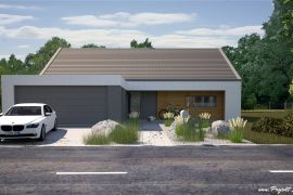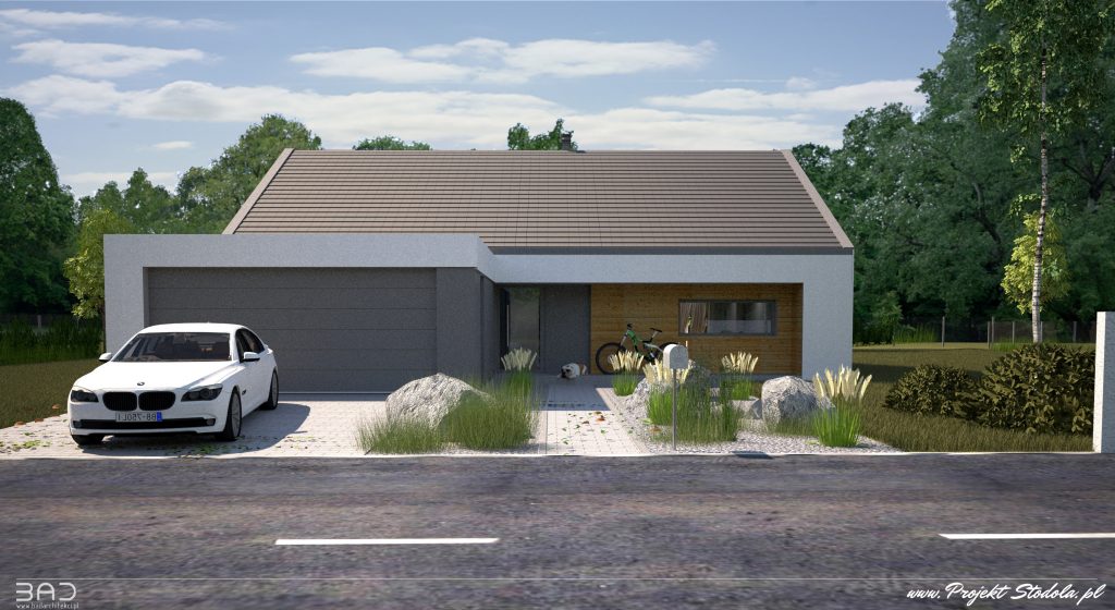 Prosty dom parterowy (z możliwością adaptacji poddasza), na planie prostokąta, przykryty dwuspadowym, symetrycznym dachem o kącie nachylenia 30° (kalenica równoległa do drogi dojazdowej). Do budynku, od strony wjazdowej, dostawiono bryłę garażu (bryła jest niezależna i budynek może istnieć bez garażu). Bardzo prosty układ konstrukcyjny opierający się na trzech osiach, prosty dwuspadowy dach i drewniany strop sprawia, że dom jest łatwy i ekonomiczny w budowie. Elewacja budynku- nowoczesna i minimalistyczna, w tonacji naturalnej- biel połączona z drewnem. Istnieje możliwość dopasowania materiałów tak, by nawiązać do lokalnego kontekstu lub indywidualnych upodobań inwestora. Urbanistycznie budynek pasuje do działki z wjazdem od północy. Istnieje możliwość zmiany lokalizacji garażu, tak by budynek pasował do wąskich działek z wjazdem od wschodu i zachodu. Projekt dostępny jest w wersji lustrzanego odbicia.